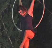 Mientras una joven despliega sus movimientos en un trapecio de vuelo, un poeta recita a Oliverio Girondo.