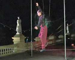 También un hombre, ensaya pasos de baile sobre la cuerda, salta y hasta camina para atrás, sorprendiendo a los espectadores y sobre una especie de sube y baja, una báscula, los hombres de la troupe intentan seducir a las “pebetas” con sus acrobacias.