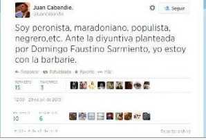 “Soy peronista, maradoniano, populista, negrero, etc. Ante la disyuntiva planteada por Domingo Faustino Sarmiento, yo estoy con la barbarie”, escribió el camporista desde su cuenta oficial, aunque minutos después borró la publicación un tanto inoportuna.
